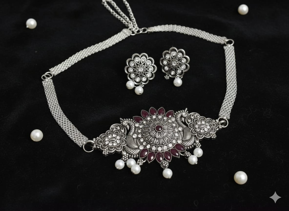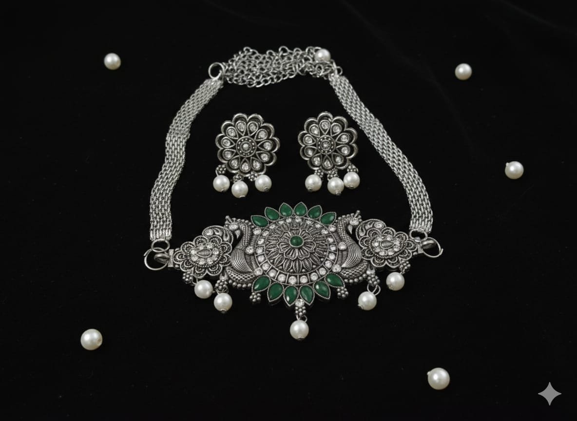 Experience the blend of exquisite design, comfort, and craftsmanship that defines this oxidized silver necklace set. Make it an essential addition to your collection today!